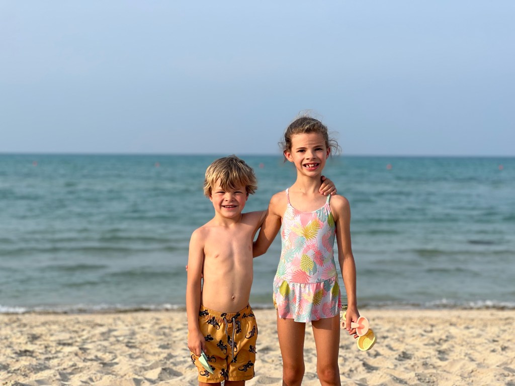 Daarna wouden de kids even in de zee! Rap hun zwemgerief aangetrokken en genoten van het water dat toch wel rond de 40 graden Celcius is. Nog een beetje warm maar de kids vonden het geweldig om schelpjes te zoeken die ze op het Belgische strand niet makkelijk tegenkomen. De vangst hiervan zullen we later eens posten.