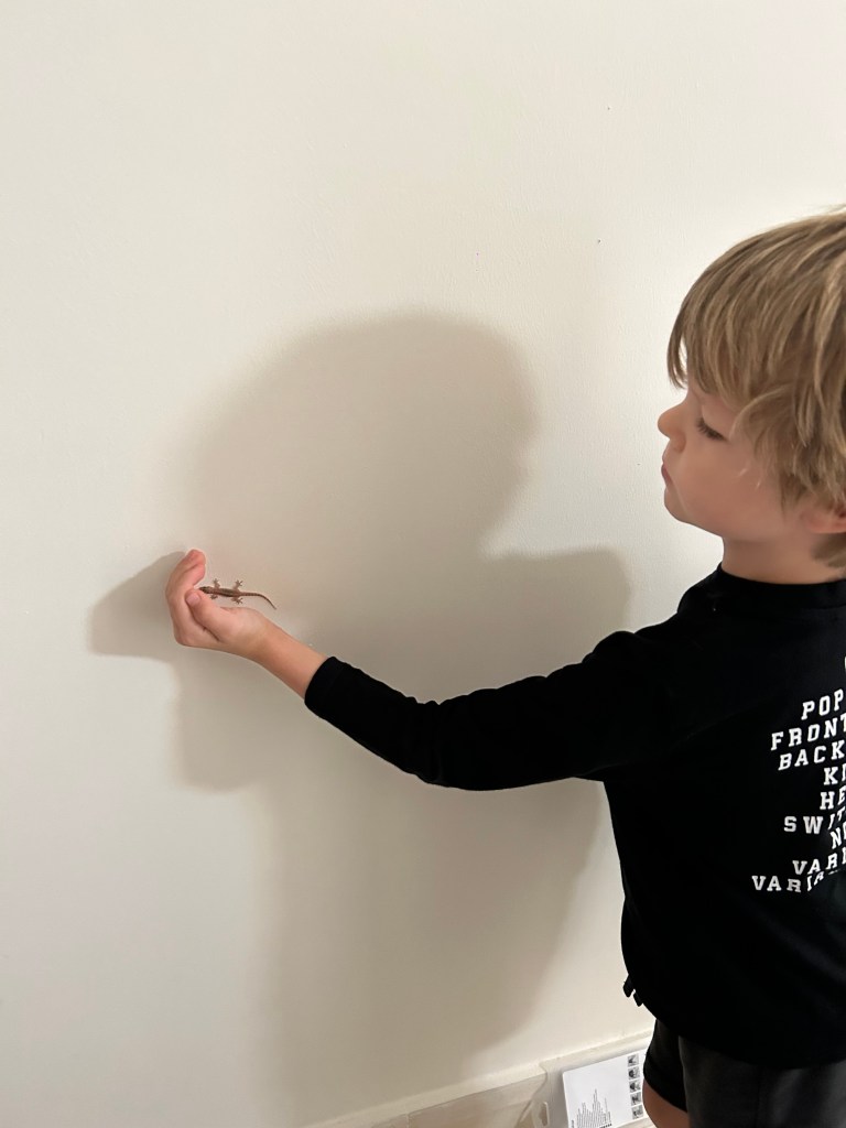De kids zijn steeds geïntrigeerd en proberen dan te achterhalen wat er hier allemaal leeft. Deze keer vonden ze een klein hagedisje die evensnel weg was, dan dat hij kwam.