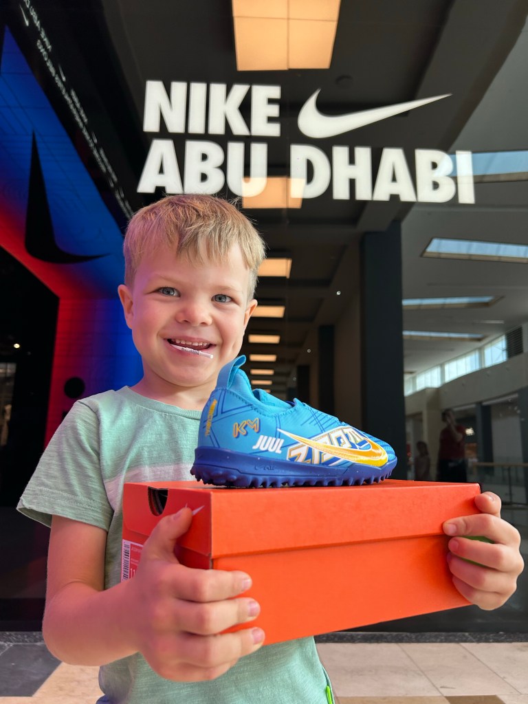 Juuleke speelt sinds kort voetbal en hij had voetbalschoentjes nodig. Het bleek geen sinecure te zijn om indoor voetbalschoentjes te vinden in zijn maat. Maar op de valreep heeft hij er gevonden. Hij kreeg er zelfs zijn naam op geprint. Hij was zo fier als ne gieter: