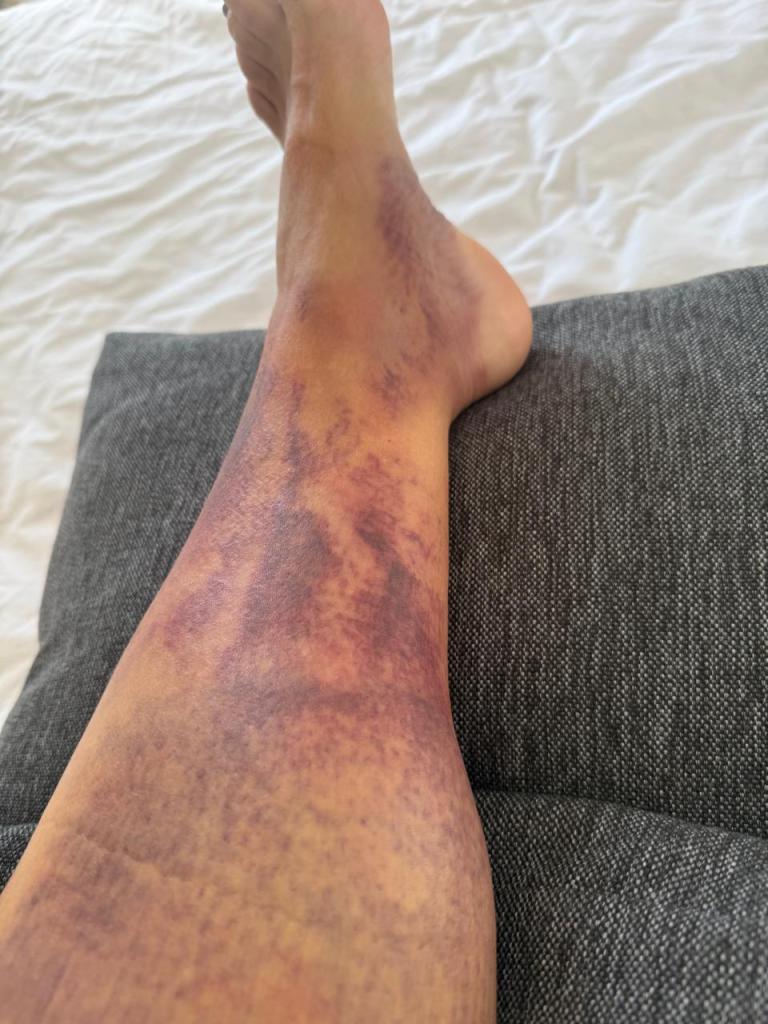 Jammer genoeg is Ann tijdens de aankomst op de Ironman, gevallen over de geribbelde rode loper. Deze lag helemaal niet strak en daardoor is ze gestruikeld en op haar knie terecht gekomen. Hierdoor had ze een stevige blauwe plek die volledig gezakt was in de rest van haar onderbeen, gepaard met pijn.