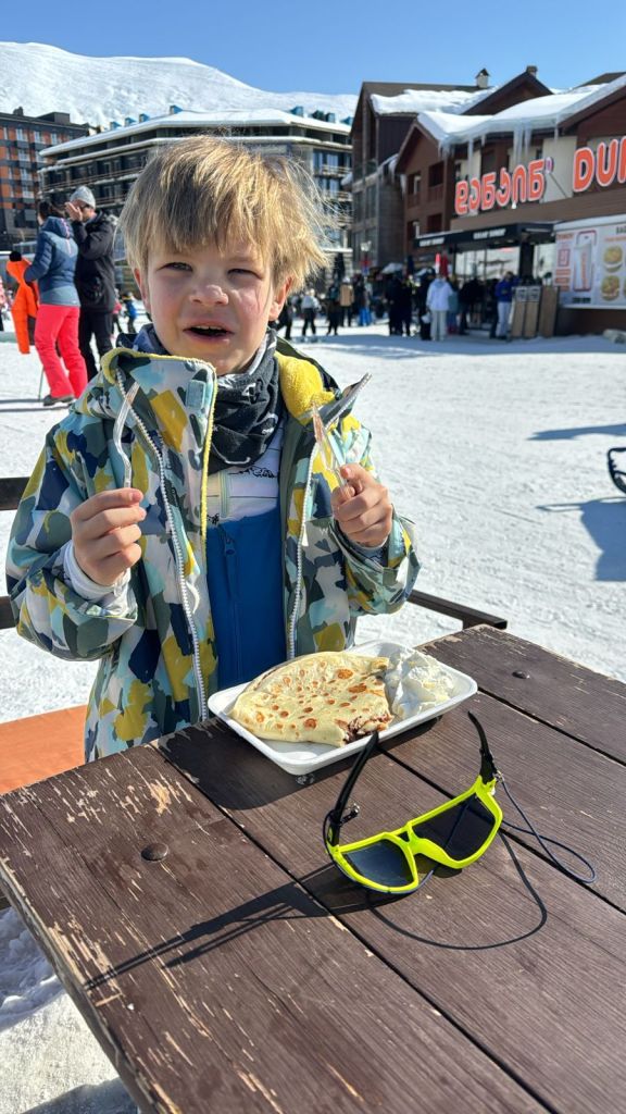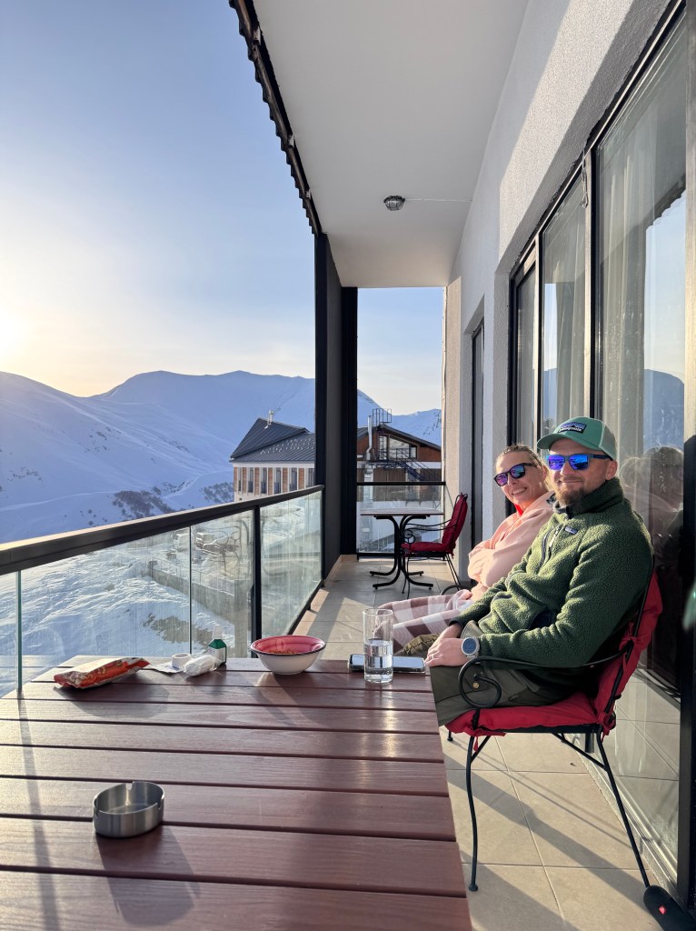 Eenmaal aangekomen in het skiresort (Gudauri, zo’n 40km van de Russische grens in het Kaukasusgebergte), kwamen we in een sfeer dat sterk op een Frans skiresort lijkt. Overal hotelletjes, appartementsgebouwen, barrekes en restaurantjes.