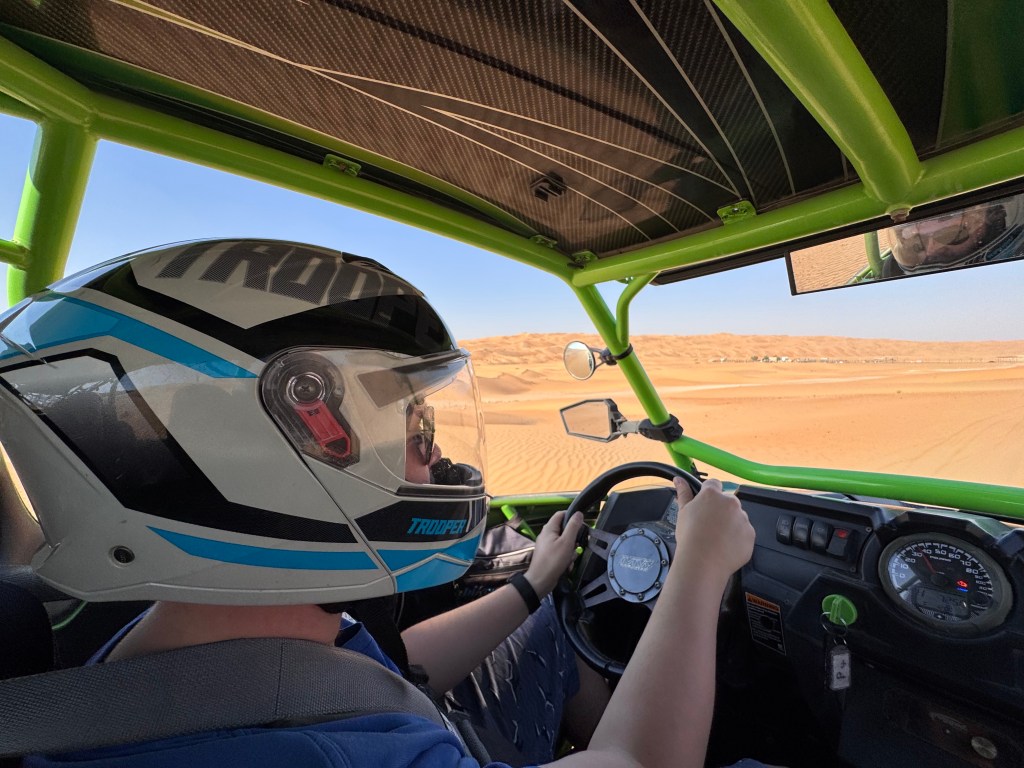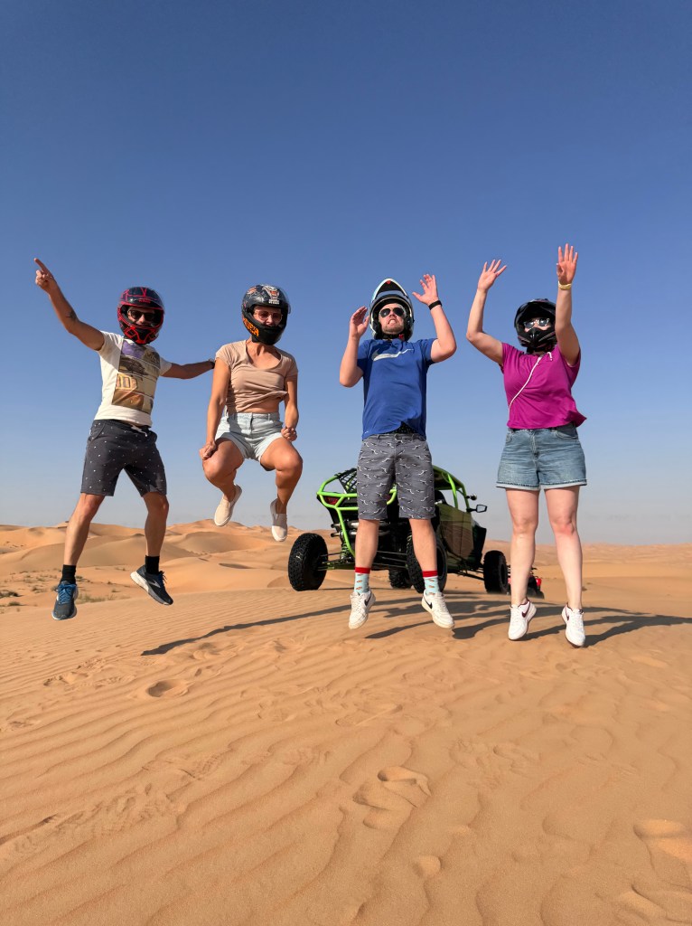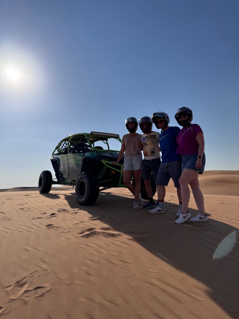 In een buggy konden we zelf rijden door de woestijnduinen. Een beetje adrenaline om het chillen te doorbreken: