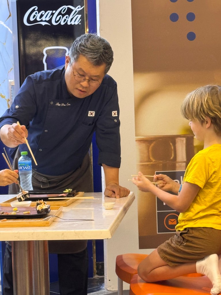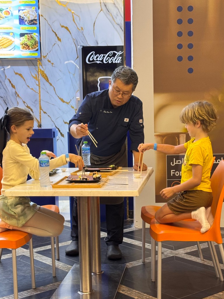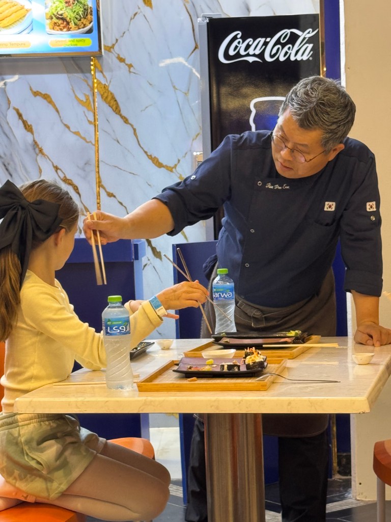 Ook opende er een nieuwe zaak in de mall waar ze Sushi serveren. Onze kids kregen er een les ‘eten met stokjes’ van nen échte Koreaan. 🥢🍣